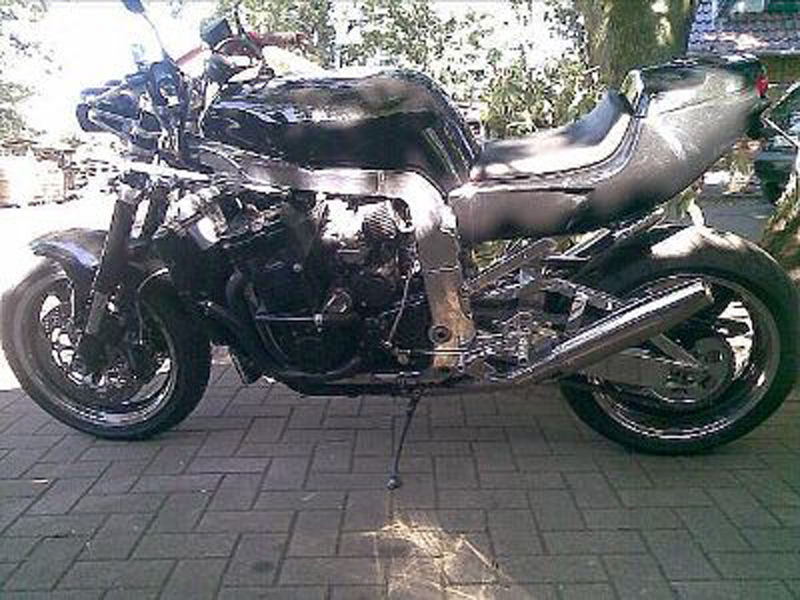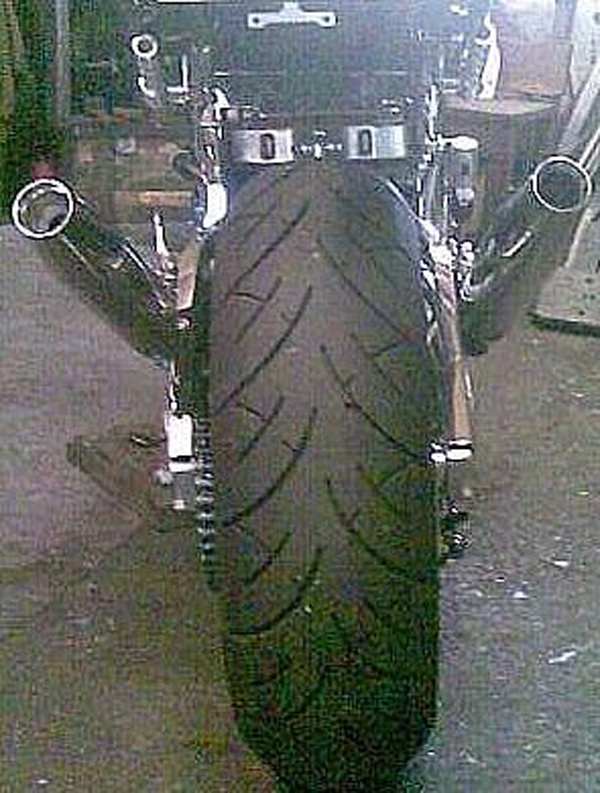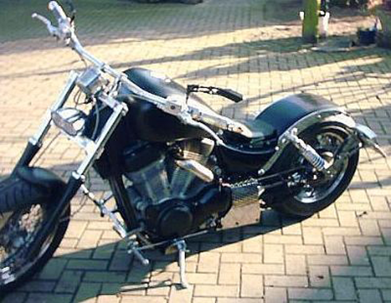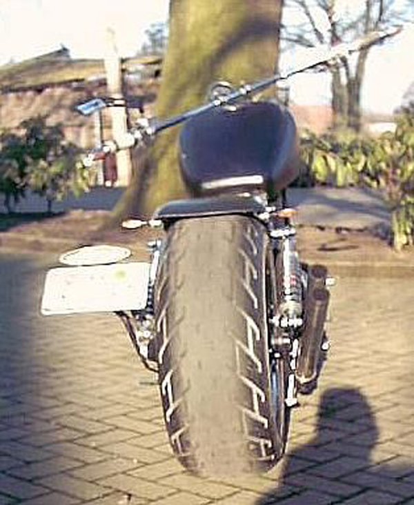 die Schwinge, für ein 8*15zoll Felge mit 230 Bereifung, Änderung der hinteren Bremsanlage, das Heck, eine breite Gabelbrücke für eine 4*15zoll Felge mit 150 Bereifung, eine komplett neue Auspuffanlage (geiler Klang), ein neuer Alutank mit 19 Liter.. und viele Kleinigkeiten ........
