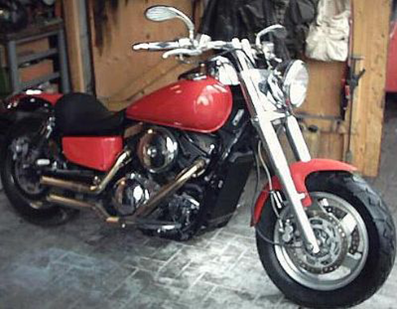Links eine VN1500 mit neuem Lack, alle Kabel im Lenker, neue komplette Auspuffanlage, Stahlflex vorn und hinten
